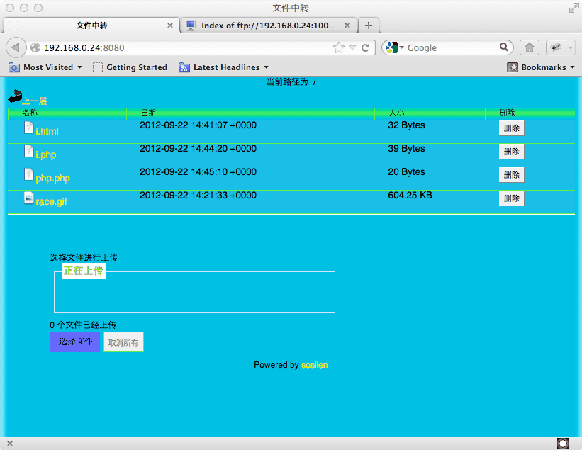 Browsing to http://<target_ip>:8080/ presents an index page in which anyone can upload files to the web servers root directory.