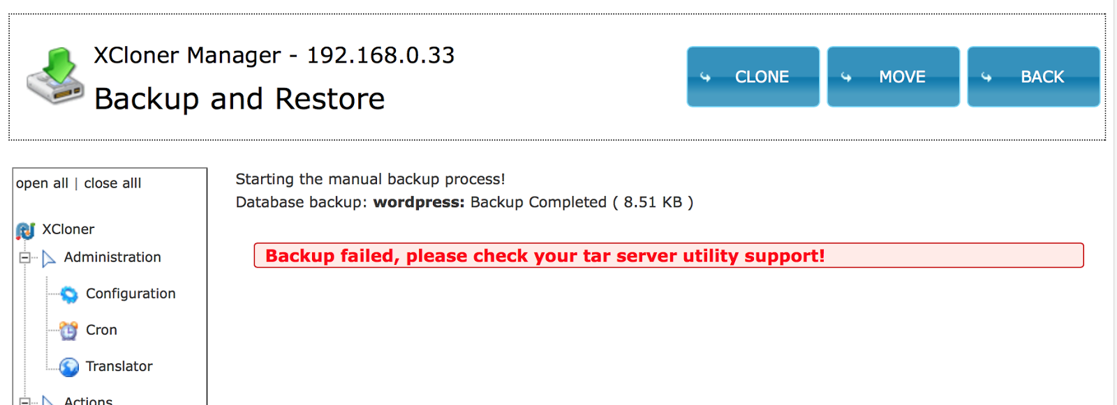 “XCloner is a tool that will help you manage your website backups, generate/restore/move so your website will be always secured! With XCloner you will be able to clone your site to any other location with just a few clicks. Don't forget to create the 'administrator/backups' directory in your Wordpress root and make it fully writeable.”